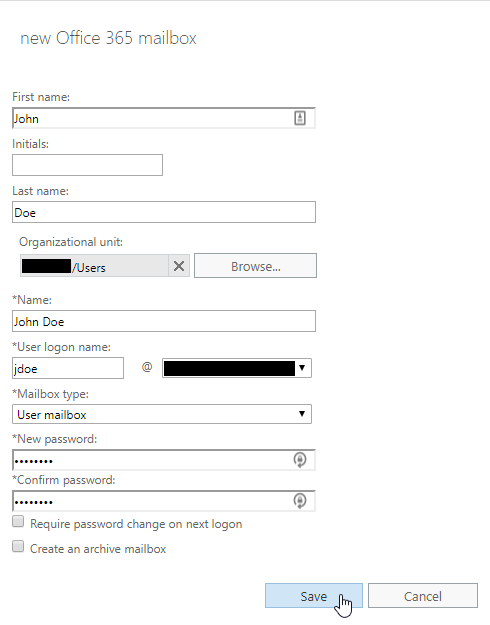 In the New Microsoft 365 Mailbox dialog, fill out the new user's details, choose the Organizational Unit where the new user object will be located, and click Save.